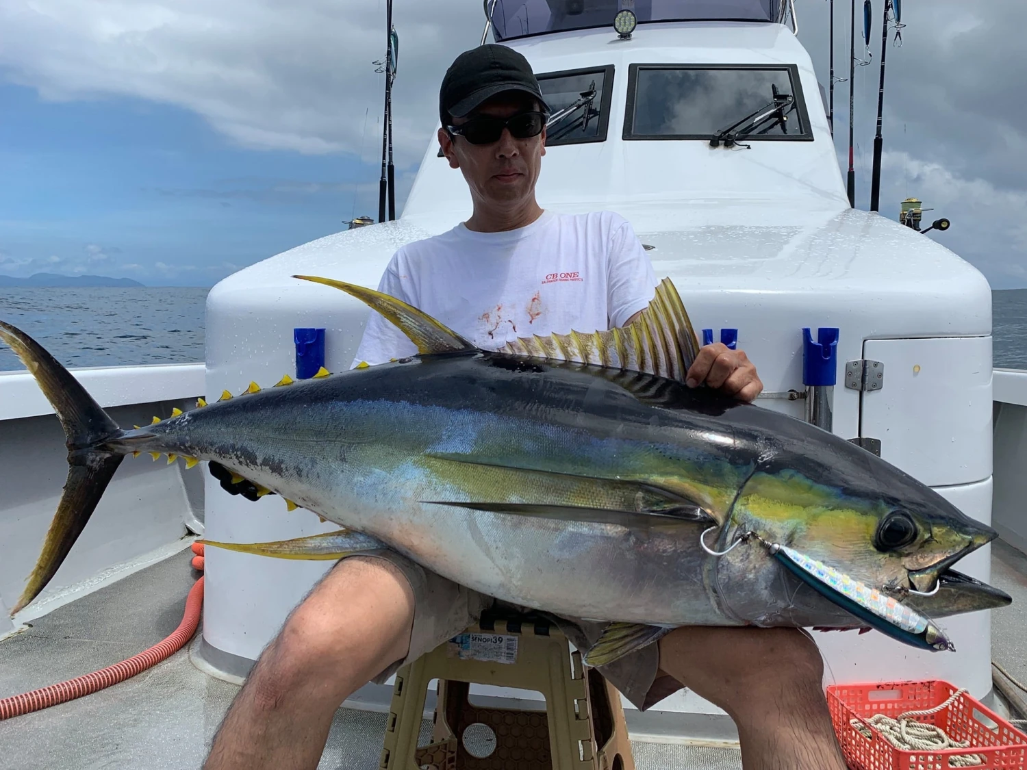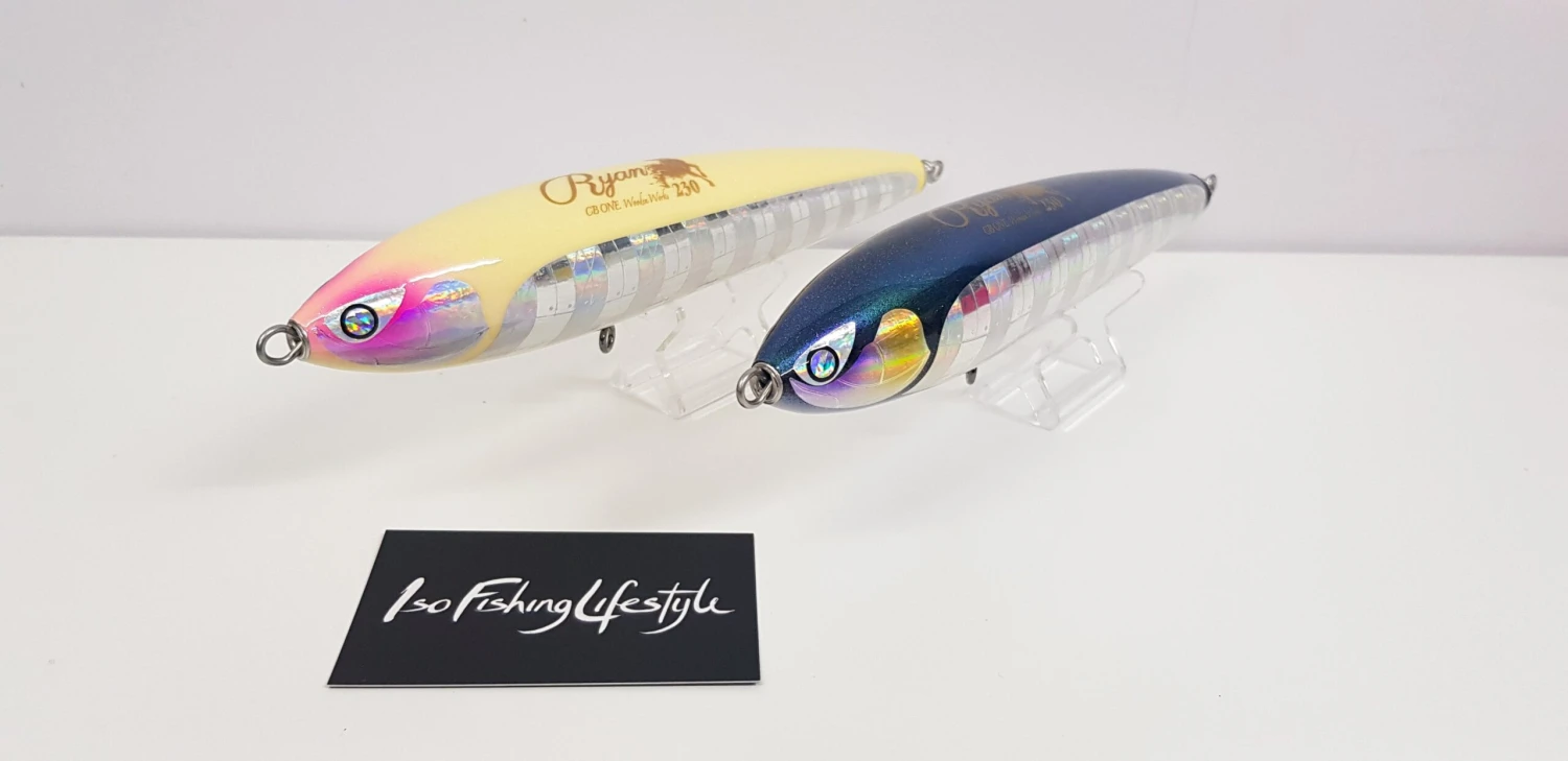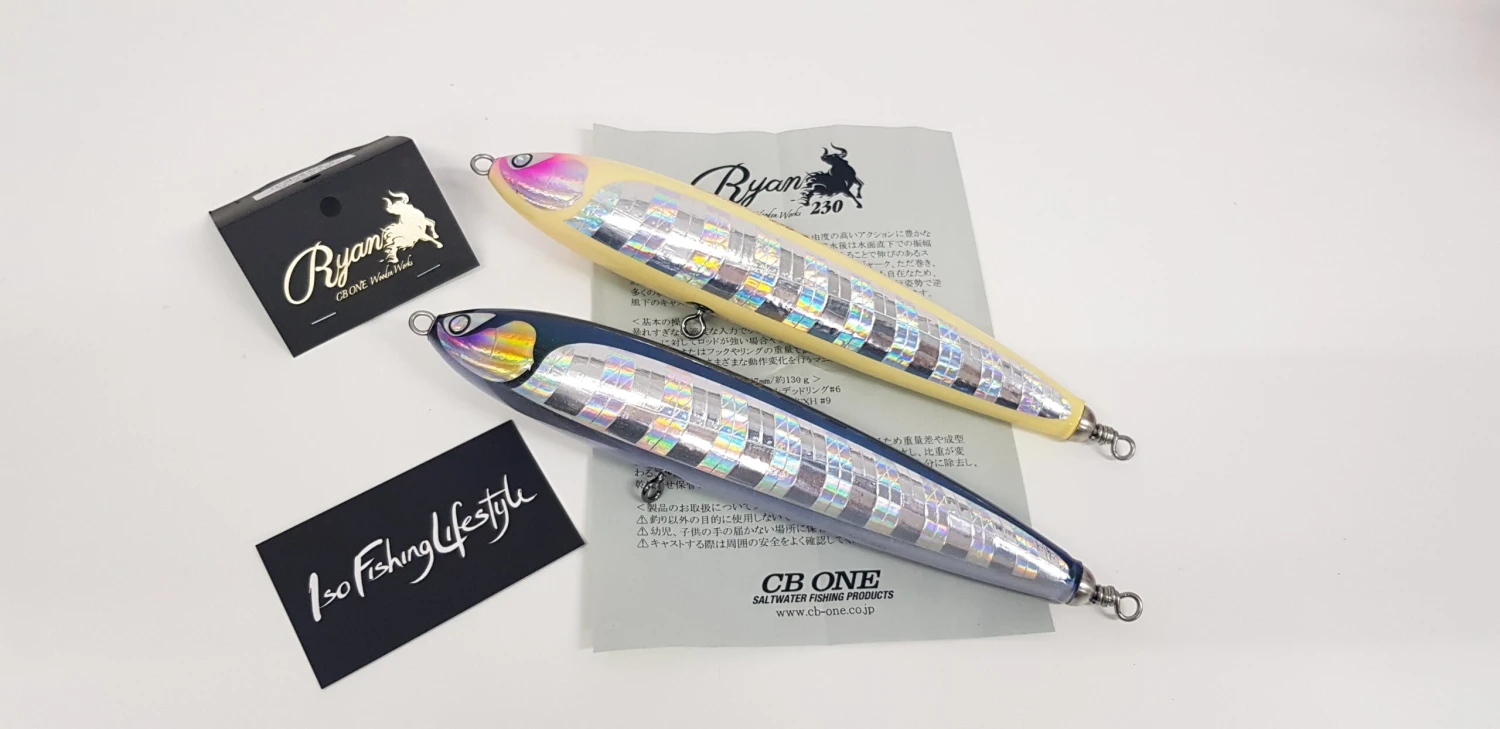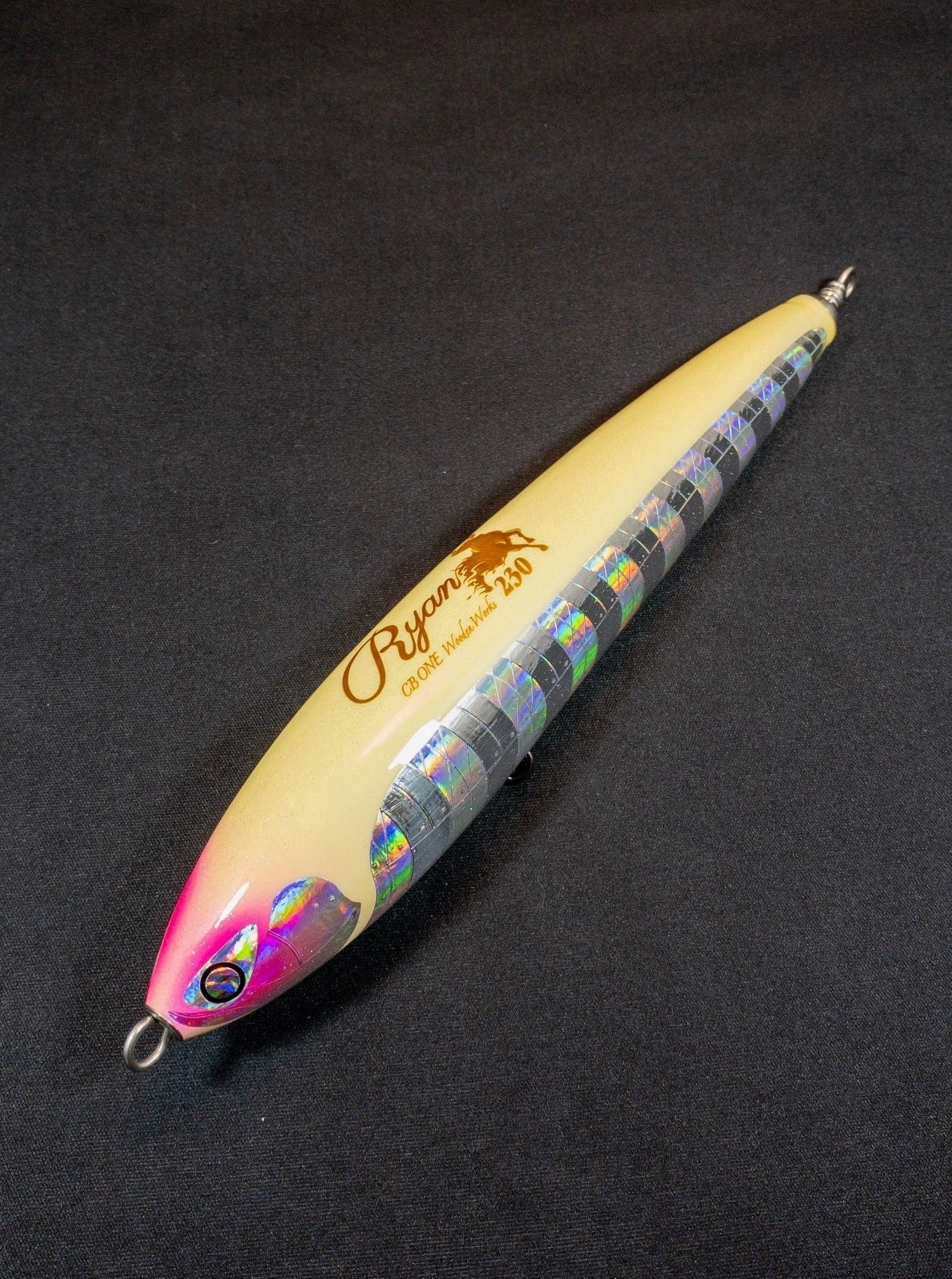 The CB One Ryan 230 stick bait is a work of art. These hand carved wooden lures feature a foil finish and a beautiful paint job. Designed to sit with its tail down at rest and create a nice bubble trail when pulled under the surface. The ‘S’ swimming action creates plenty of flash to imitate a fleeing bait fish. The Ryan 230F is an excellent lure for targeting GTs, Big Kingfish and Tuna. A must have lure for the enthusiast stick bait angler!!Â