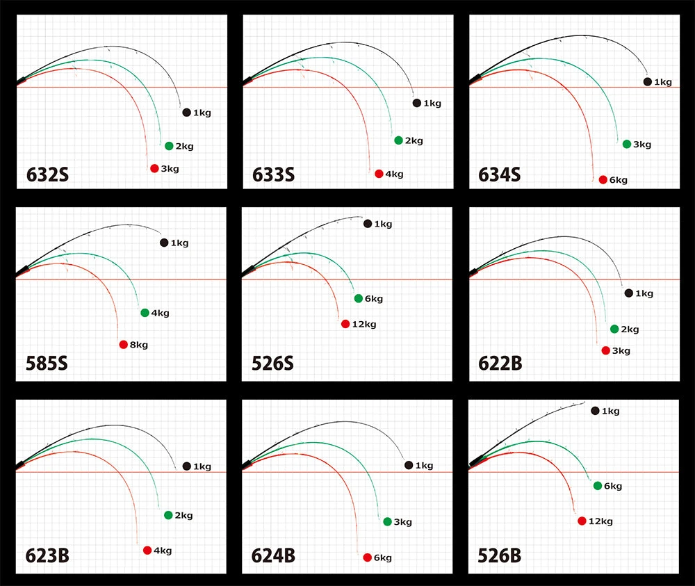 Spinning Model:622S,633S and 634S bend smoothly till belly section when you load so easier to keep your jig under control as you wished to.