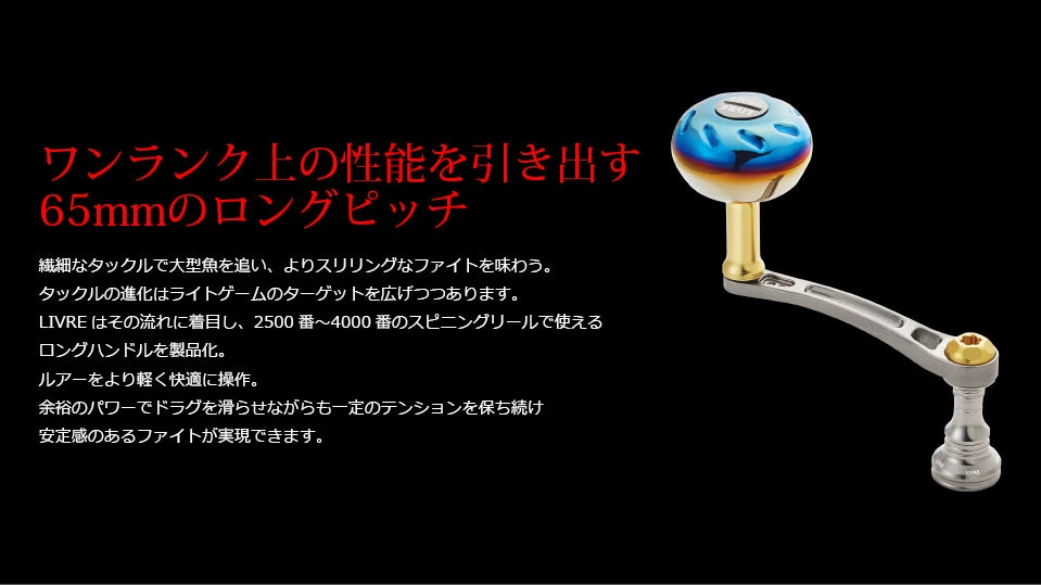 A custom handle + handle knob set by Livre Japan suitable for smaller sized reels for more crank and torque. The specially designed power handle will enable anglers to wind lures easier and have more control when fighting a fish.Â