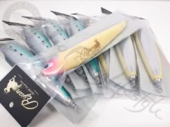 The CB One Ryan 250 stick bait is a work of art. These hand carved wooden lures feature a foil finish and a beautiful paint job. Designed to sit with its tail down at rest and create a nice bubble trail when pulled under the surface. The ‘S’ swimming action creates plenty of flash to imitate a fleeing bait fish. The Ryan 250F is an excellent lure for targeting GTs, Big Kingfish and Tuna. A must have lure for the enthusiast stick bait angler!!Â