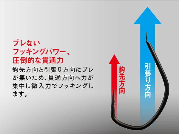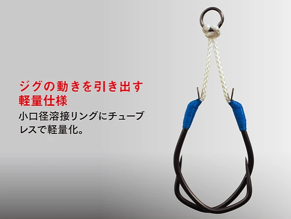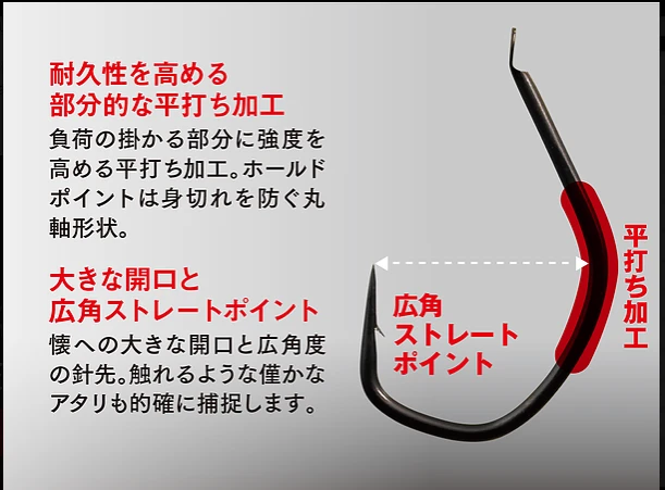 A hunting hook with a wide-angle straight tip that instantly catches prey. The best shape for light jigging games that sticks the moment a fish touches it.