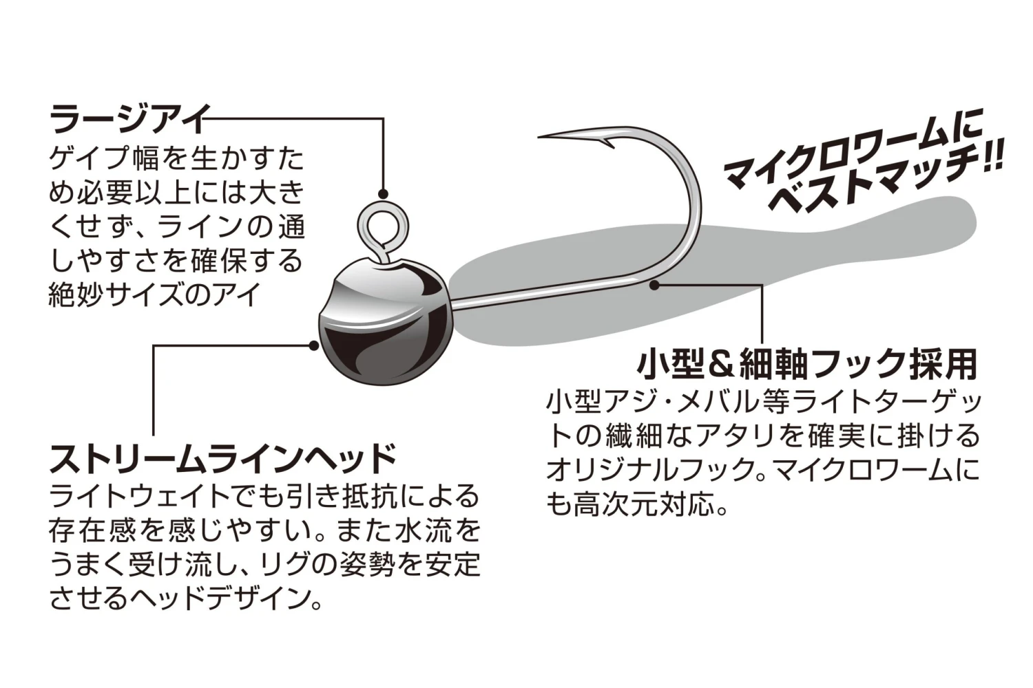 There are many light game fisherman who want to catch even a small sized fish, especially horse mackerel (yellowtail) that is 10cm or less. With fish this size, their mouthes are small, sucking power is weak and it is hard to hook. Decoy “Mini Drive” is a special jighead for catching small fish. It is equipped with a small size 10 hook that is a perfect outward round shape hardly coming out of the mouth and hardly losing hooking power once sucked. It is compatible with a variety of small fish.